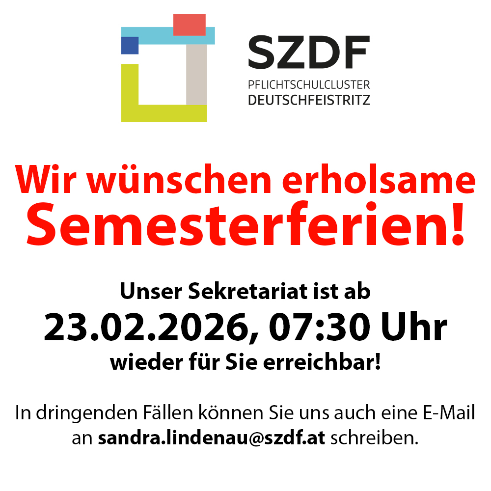 Seit 01. Februar 2023 ist die neue Homepage des Pflichtschulcluster Deutschfeistritz online. In den nächsten Wochen werden wir die Homepage um nützliche Informationen rund um unseren Pflichtschulcluster - bestehend aus den Volksschulen Waldstein und Deutschfeistritz,...