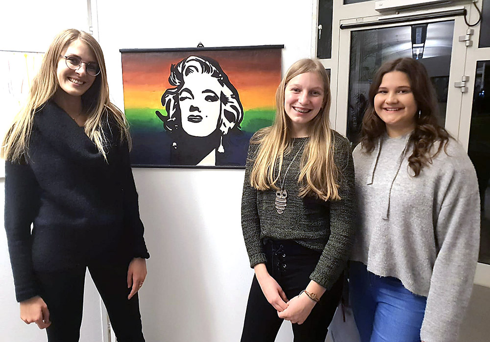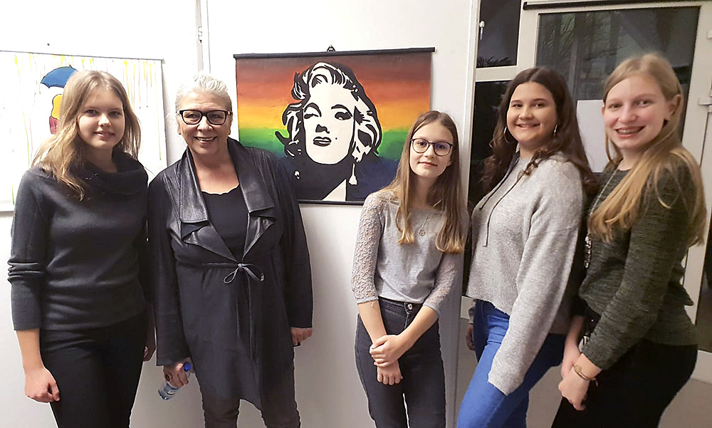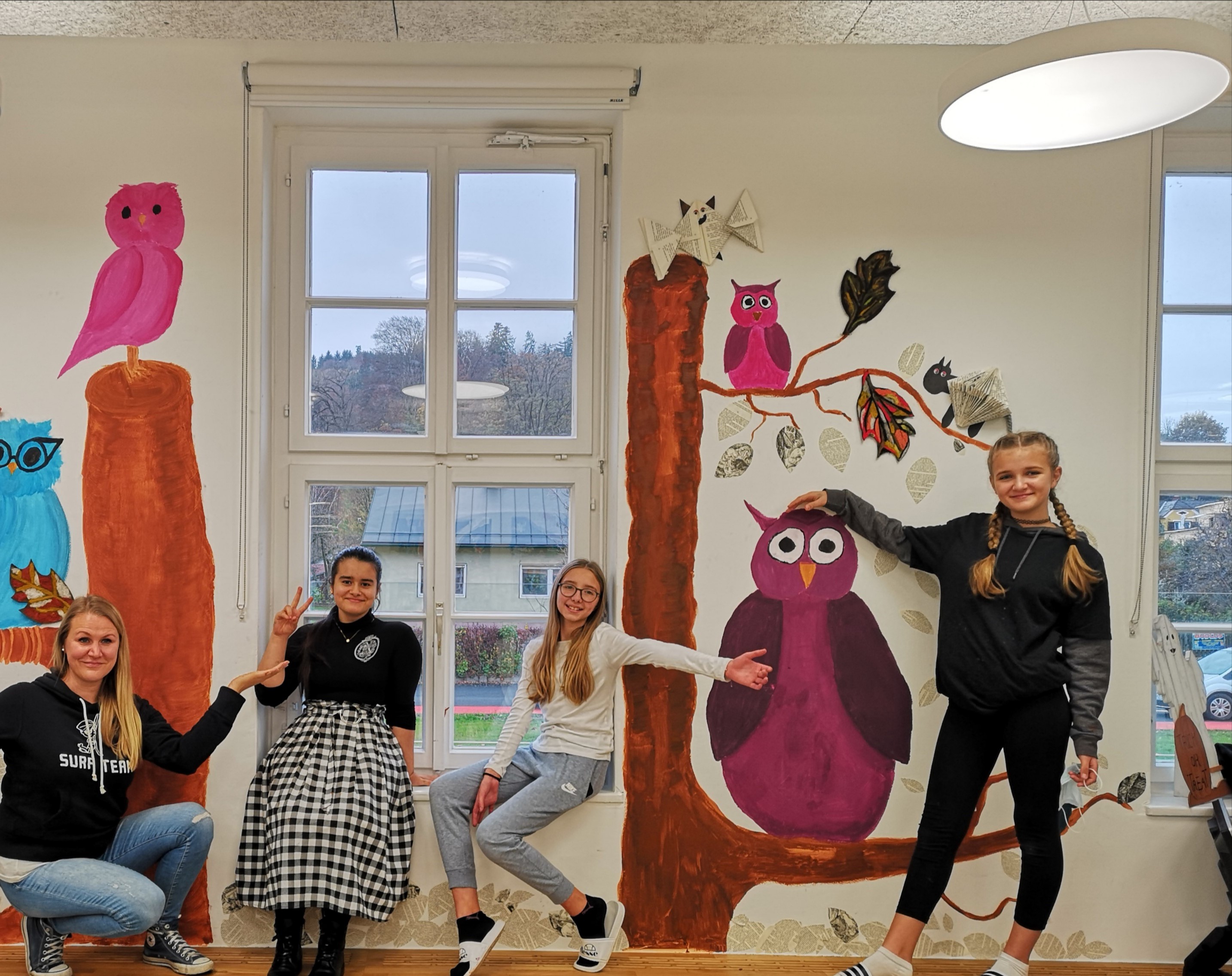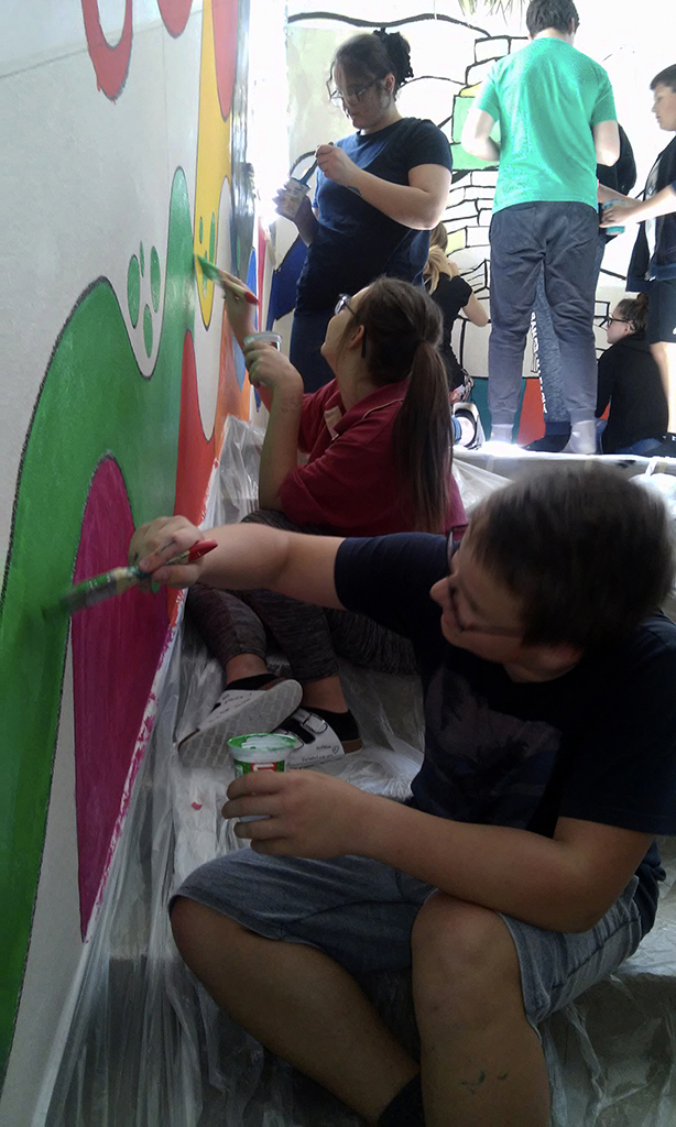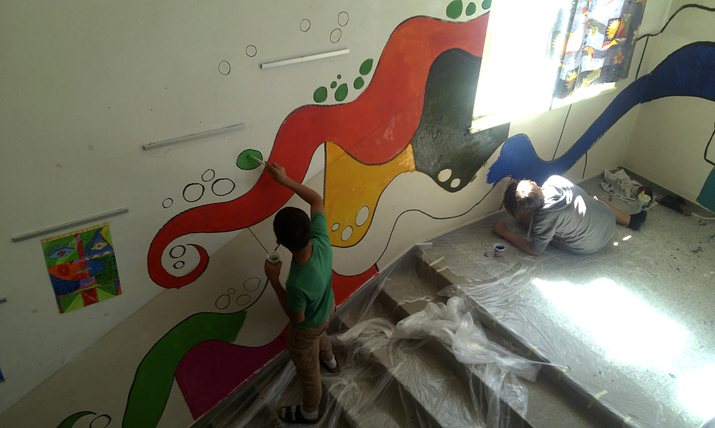 Vier SchülerInnen aus der sechsten Schulstufe gestalten gemeinsam mit ihrer Kunstlehrerin Mag. Corina Röck die Wände der Mittelschule Deutschfeistritz.