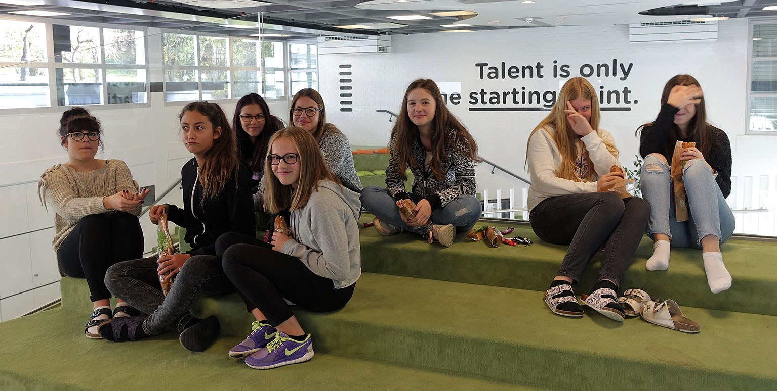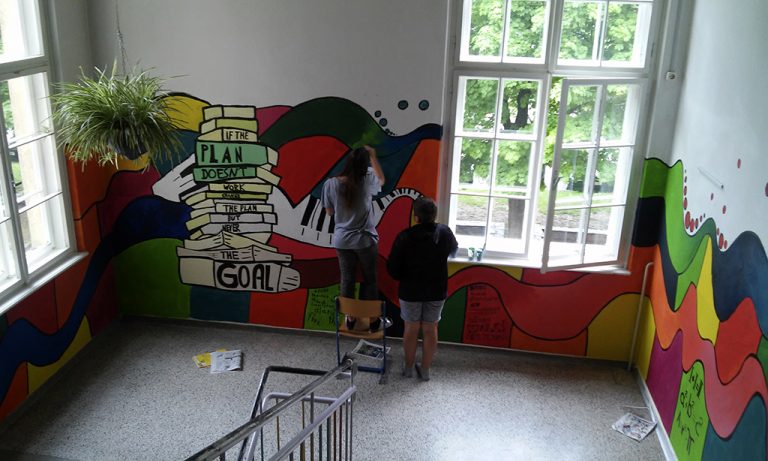 Mit viel Eifer und großer Freude, wurde entworfen, getüftelt, skizziert und schlussendlich gemalt. Wenn man vor einer so großen weißen Wand steht, bedarf es einigen Mutes um einfach mit Pinsel und Farben loszulegen. Die Mädels haben diese Herausforderung mit großer Begeisterung angenommen und das Ergebnis kann sich sehen lassen.