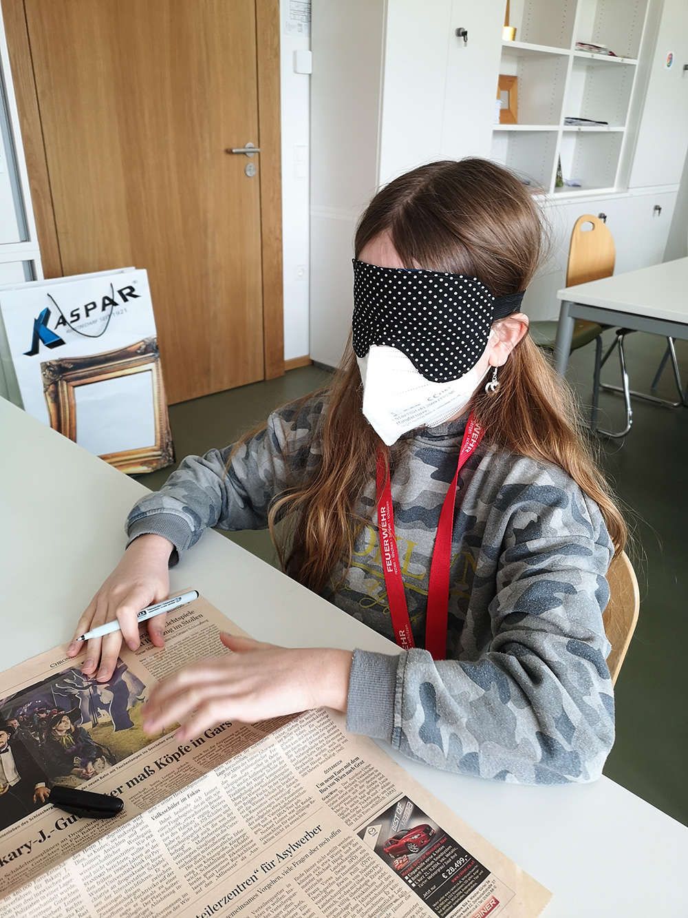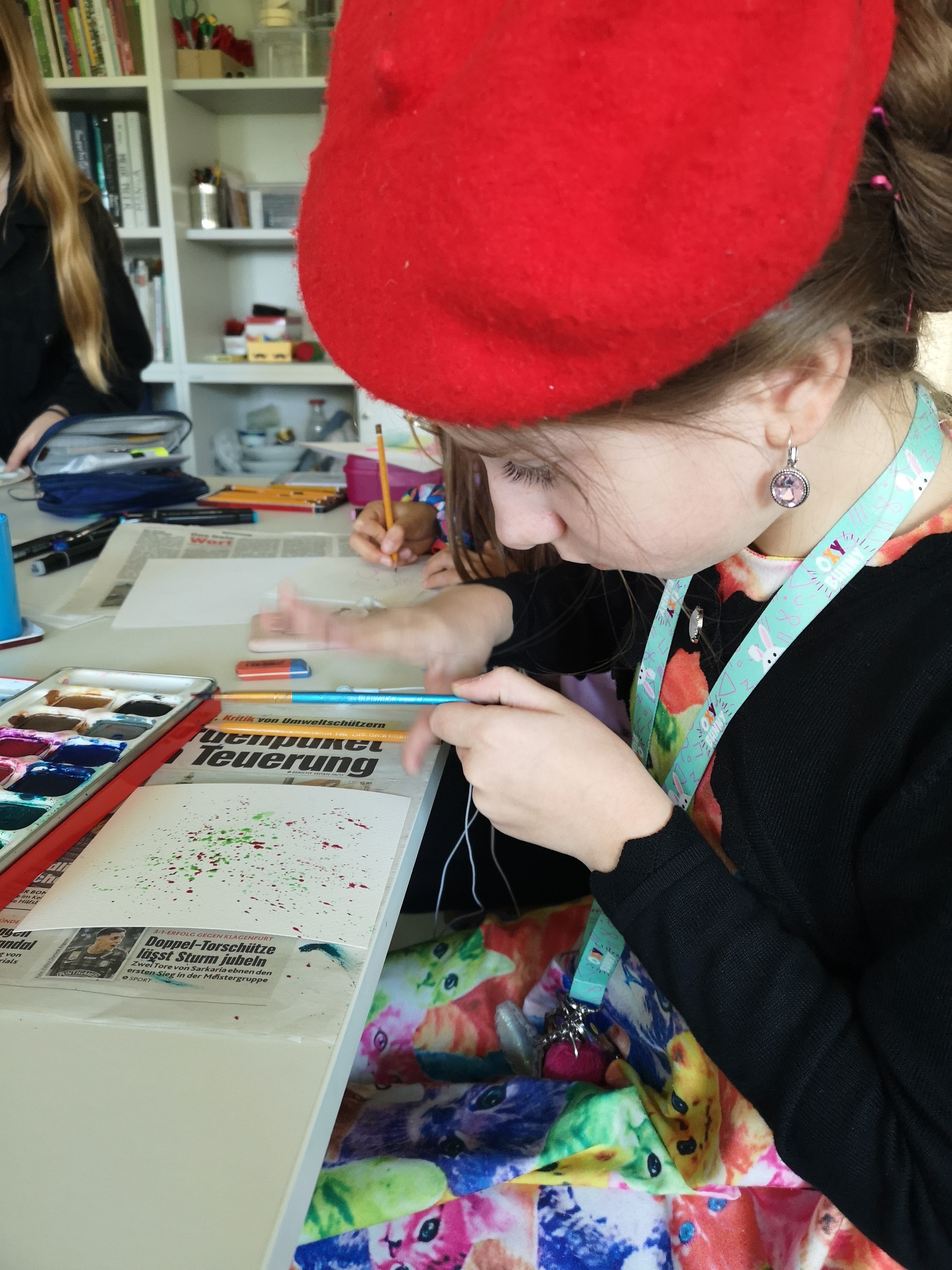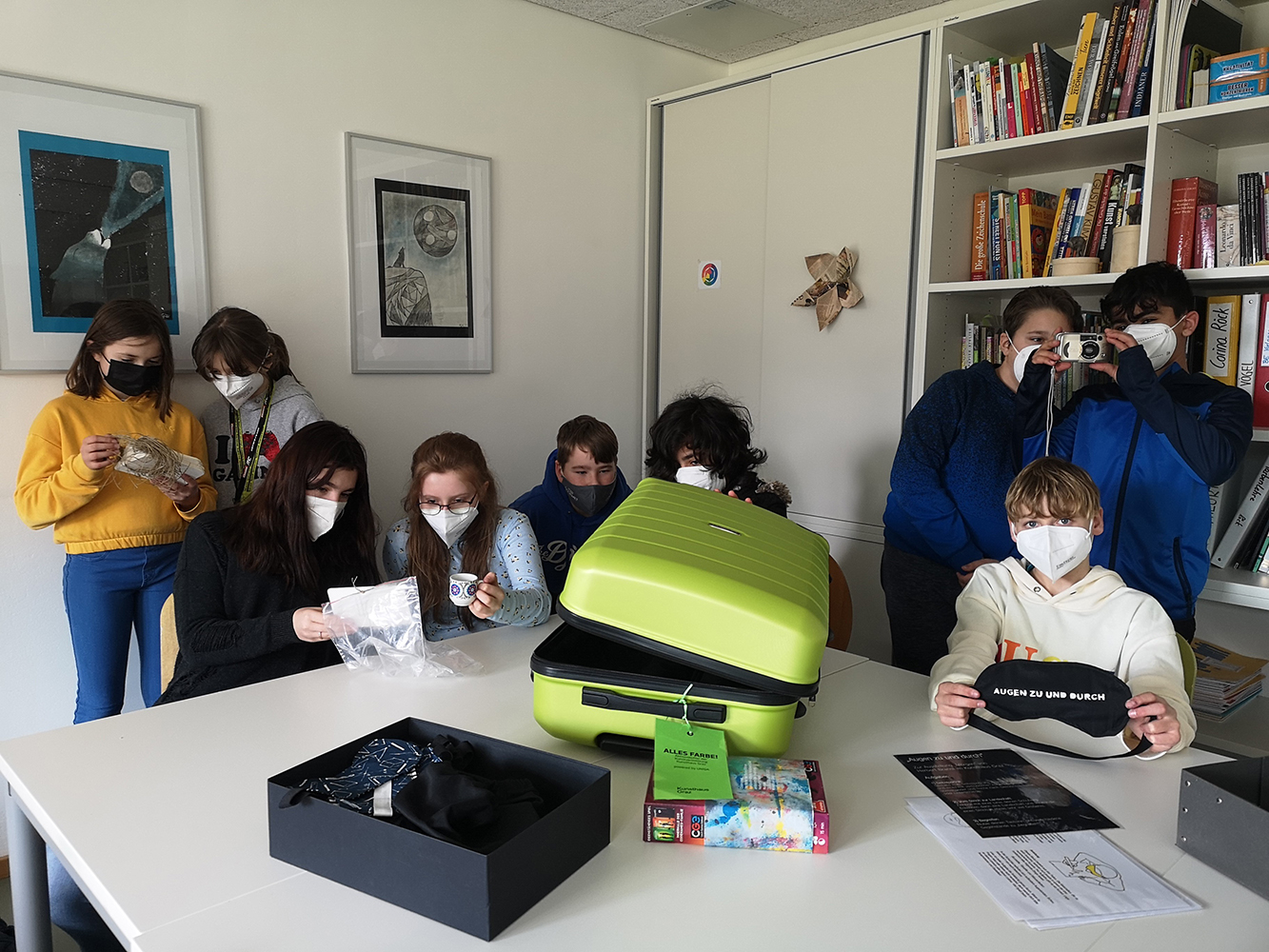 Ein grüner Aktionskoffer konnte von dort abgeholt werden und bringt das Museum ein Stück weit in die Schule. Tolle Stationen, aufbereitet von Kunstvermittlern des Museums in Zusammenarbeit gemeinsam mit Kunstschaffenden, regen die Schüler und Schülerinnen an selbst künstlerisch tätig zu werden. Sich mit dem Thema Farbe und Heimat auseinanderzusetzten ist eine spannende Sache und regt zum Nachdenken an. Auch die Station „Augen zu und durch“, das blinde Anfertigen eines Selbstbildnisses bereitete den Kindern viel Freude. Gerade in Zeiten in denen alles in Aufruhr ist, ist es wichtig auch Innenschau zu halten und künstlerisches Tun kann sehr gut dabei helfen.