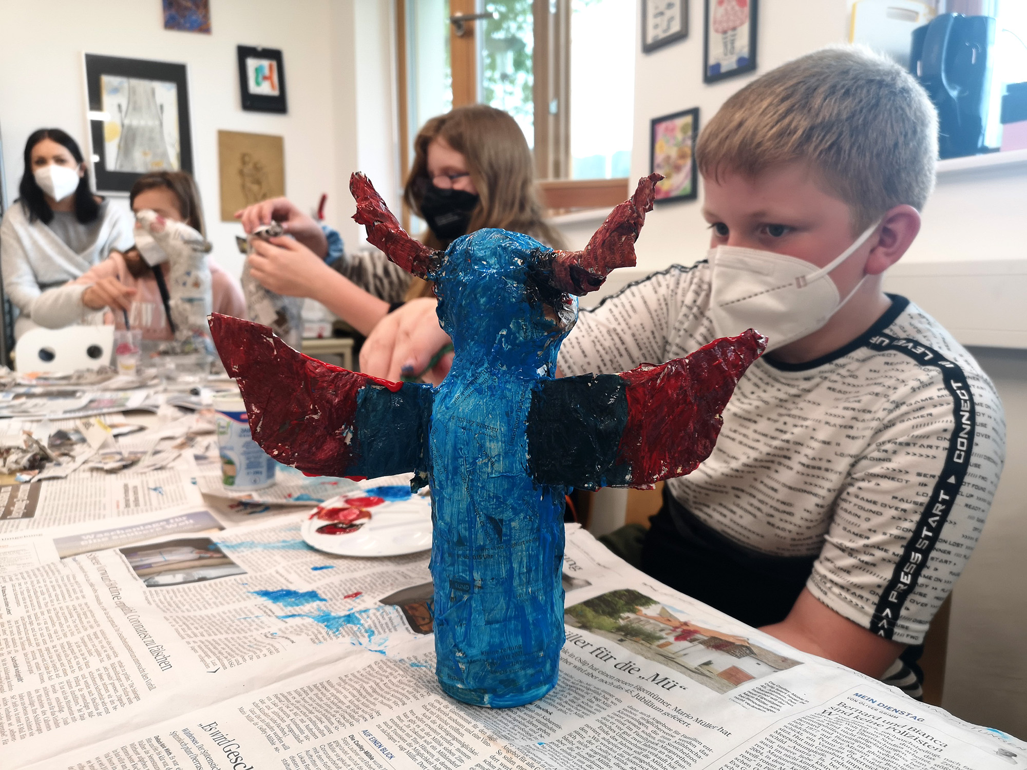 Deswegen haben sich Nico Strunz, Lisa Lampl und Corina Röck dazu entschieden ein Sprachen-Kunstprojekt ins Leben zu rufen, um den Kindern wieder Lust am Lernen und an der Sprache zu machen. Was eignet sich dazu besser, als mit einem tollen Kinderbuch zu arbeiten? – „The Snagglegrollop“, verfasst von Daniel Postgate und illustriert von Nick Price diente als wundervoller Ausgangspunkt für eine spannende Reise voller Fantasie und Freude, die sich über mehrere Wochen erstreckte. Das Fantasiewesen, Snagglegrollop, schaut nicht nur entzückend aus, sondern hat es auch geschafft, die Kinder der fünften Schulstufe der MS Deutschfeistritz zu motivieren, ihre eigenen Fantasiewesen zu erschaffen; und das alles auf Englisch. Wunderbare Texte und Erzählungen entstanden in schönen gemeinsamen Arbeitsstunden mit den Kindern. Das Highlight war es dann, diese selbstkreierten Wesen nachzubauen und zwar aus Pappmache. Das haptische Tun in Verbindung mit den selbstgeschriebenen Texten machte die Sprache an sich im wahrsten Sinne des Wortes „be-greifbar“.