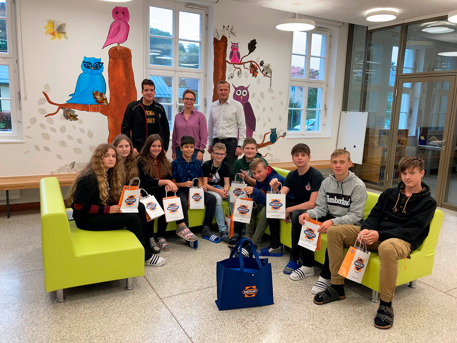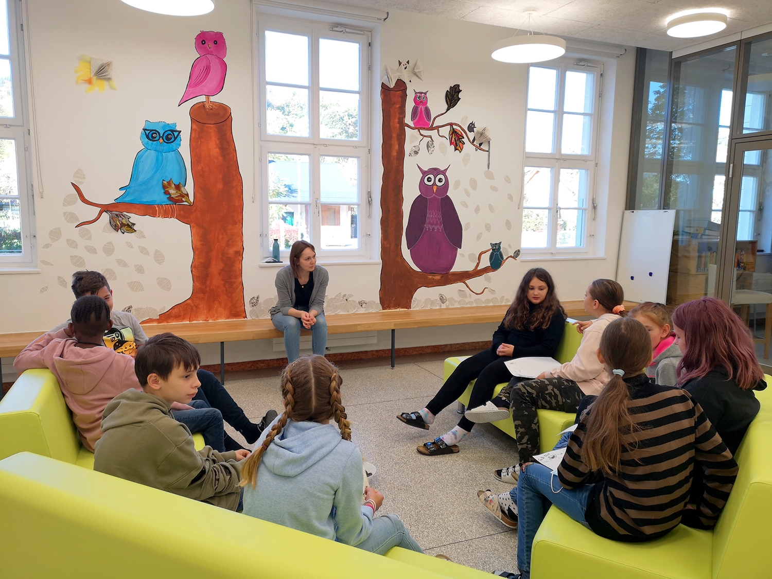 Die Leseeulen, kombiniert mit Werkstücken aus dem textilen Werkunterricht, gestaltet von Kindern gemeinsam mit Susanne Hetzinger, zieren den Bereich vor der Bibliothek der Mittelschule.
