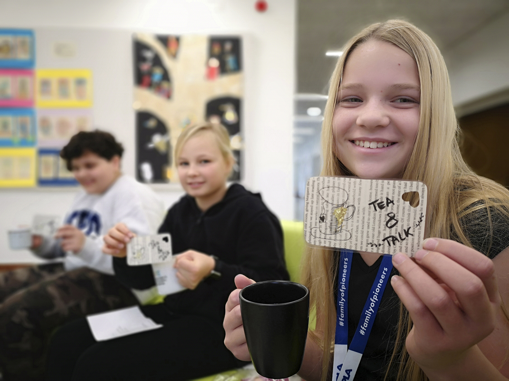 Freitags ist für die Schüler:innen der fünften Schulstufe immer ein besonderer Tag. Sie wissen, wenn sie das Tea & Talk-Ticket erhalten, dürfen sie das Klassenzimmer mit ihrem selbst mitgebrachten Heferl im Gepäck verlassen, auf der gemütlichen Couch vor der Bibliothek Platz nehmen und mit jeweils drei Mitschüler:innen aus allen drei ersten Klassen unter Anleitung einer Lehrperson auf Englisch sprechen.