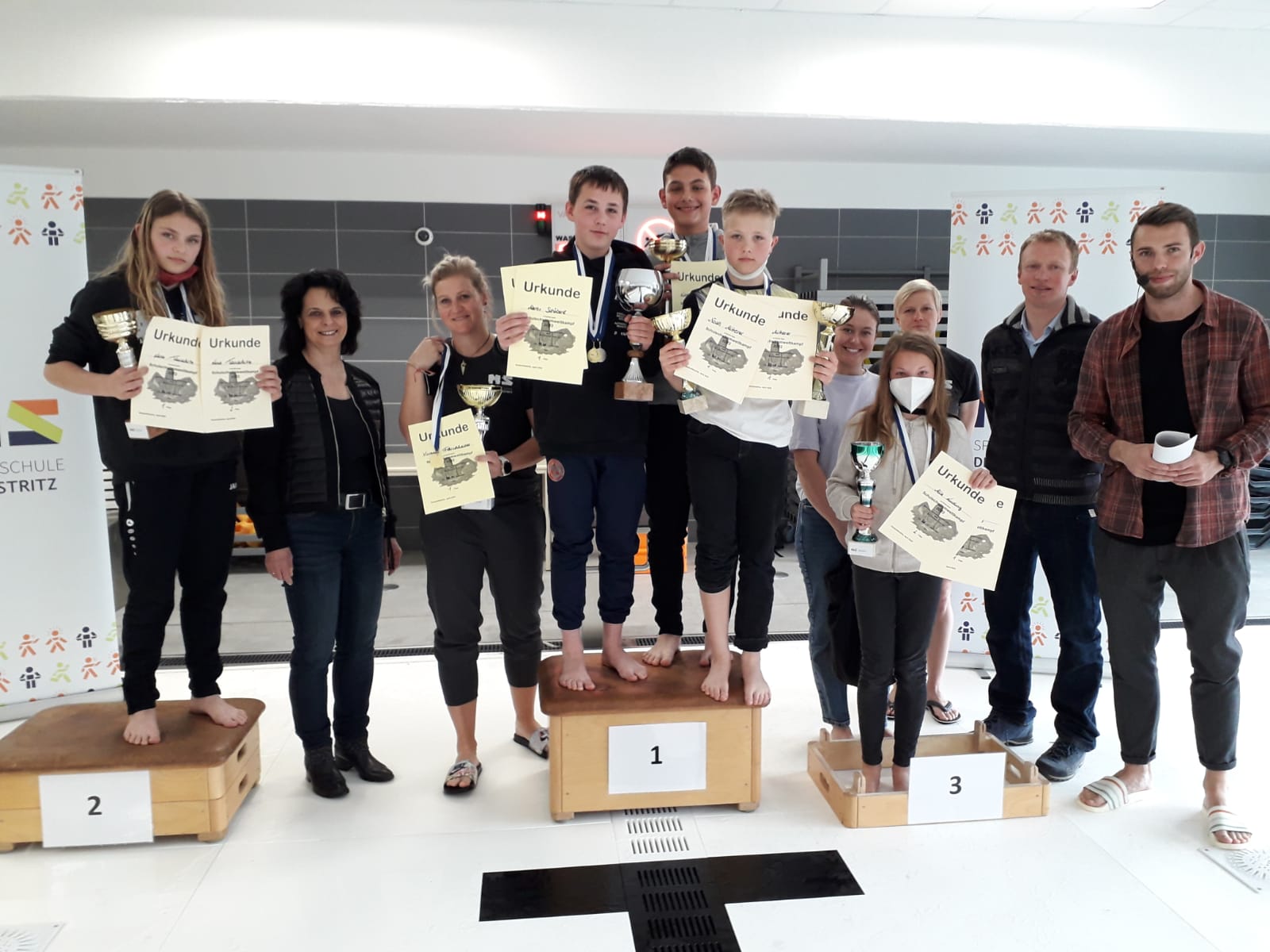 Auch in den Mannschaftswertungen konnten Medaillen mit in den Grazer Norden gebracht werden. Das Burschen-Team der 1a und 2a (S. Hahn, P. Volkmer, F. Benedikt und M. Holzmann) sowie das Mädchen-Team der 1a (K. Holler, V. Trettenbrein, L. Hörzer und M. Kainz) konnten sich jeweils den 3. Platz sichern. Das Mädchen-Team der 2a und 3a (M. Ludwig, H. Koch, J. Heinisch und K. Arbesleitner) konnte sich in ihrer Altersklasse über die Goldmedaille freuen.