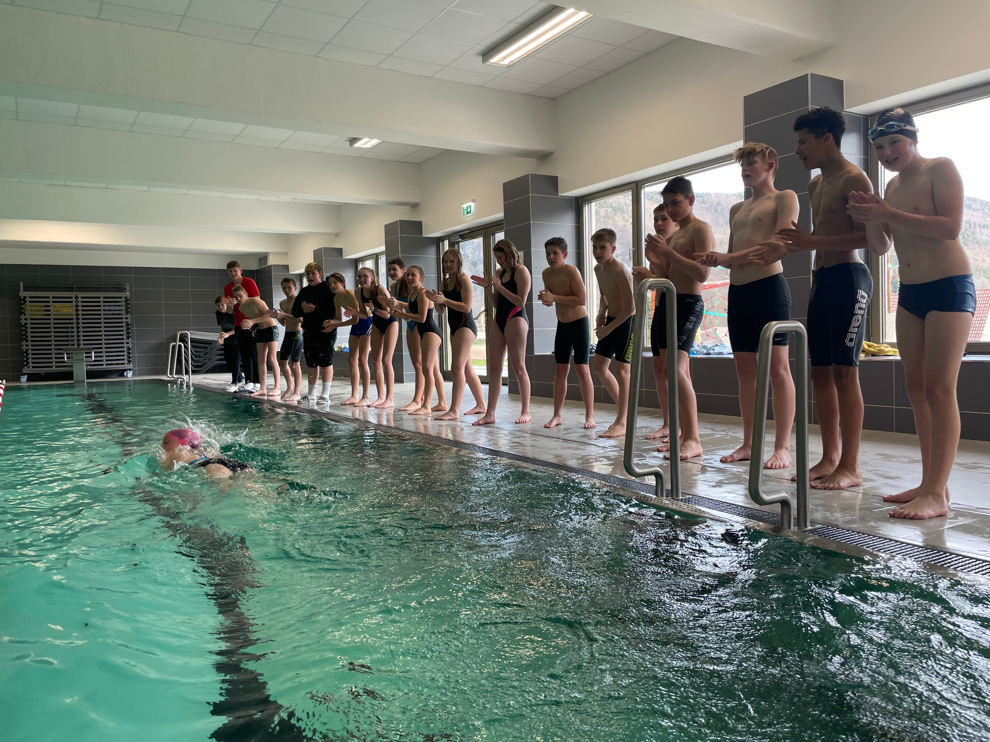 Nach 4-jähriger Pause – aufgrund des Schulumbaus sowie Covid-bedingt – war es am 07.04.2022 endlich wieder so weit und es wurde der interne Schwimm-Wettkampf an der Schule ausgetragen. Das Ambiente des neuen, wunderschönen Schwimmbades ließ keine Wünsche offen und die Schülerinnen und Schüler konnten unter optimalen Bedingungen ihre Längen im neuen Bad ziehen.