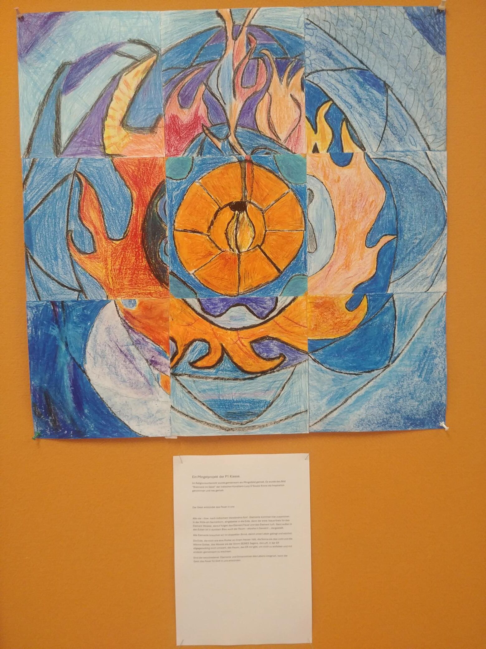 Im Religionsunterricht wurde gemeinsam ein Pfingstbild gemalt. Es wurde das Bild “Brennend im Geist” der indischen Künstlerin Lucy D’Souza-Krone als Inspiration genommen und neu gemalt.