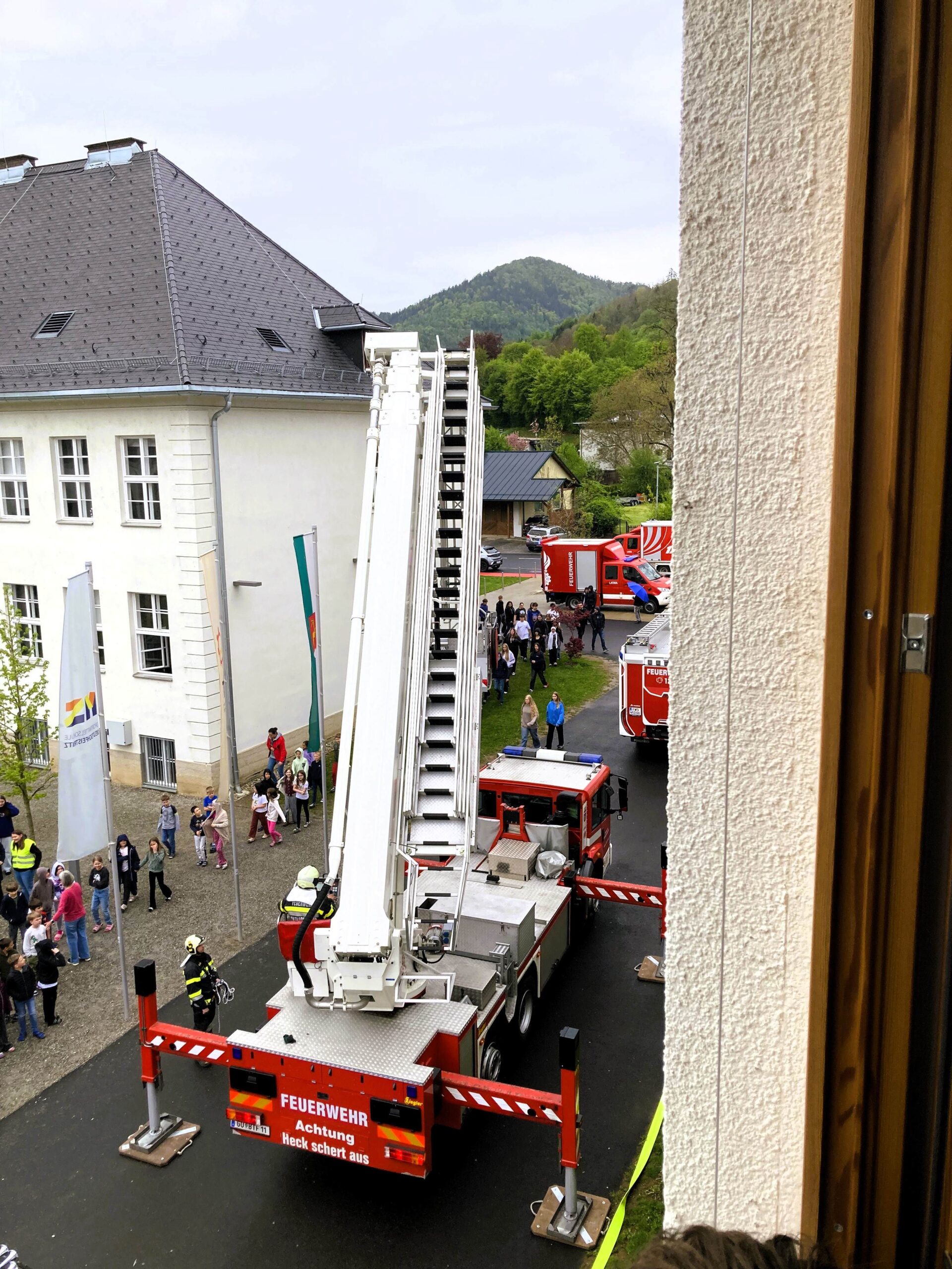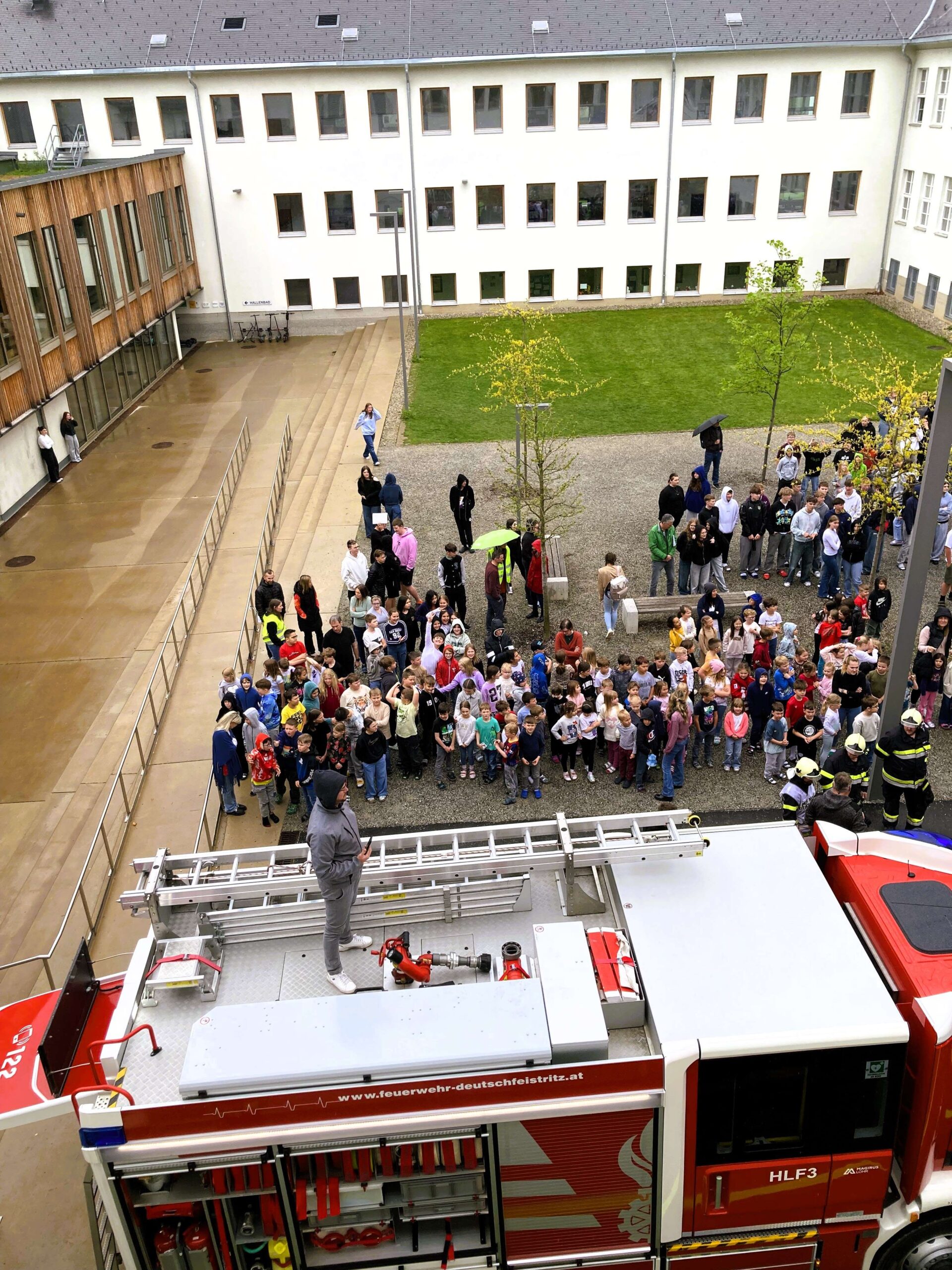 Rund 500 Schüler:innen und das gesamte Lehrerteam der Mittelschule, Volksschule und der Polytechnischen Schule mussten die Schulräume verlassen. Sammelpunkt war der Sportplatz.