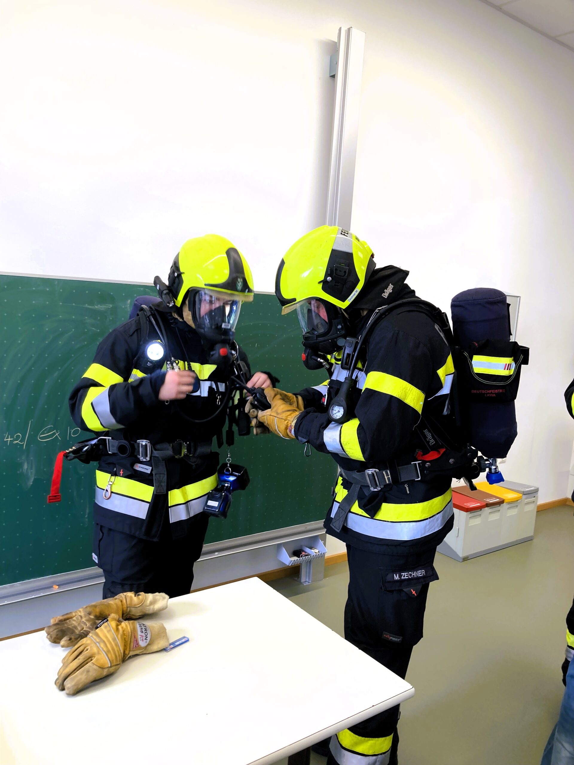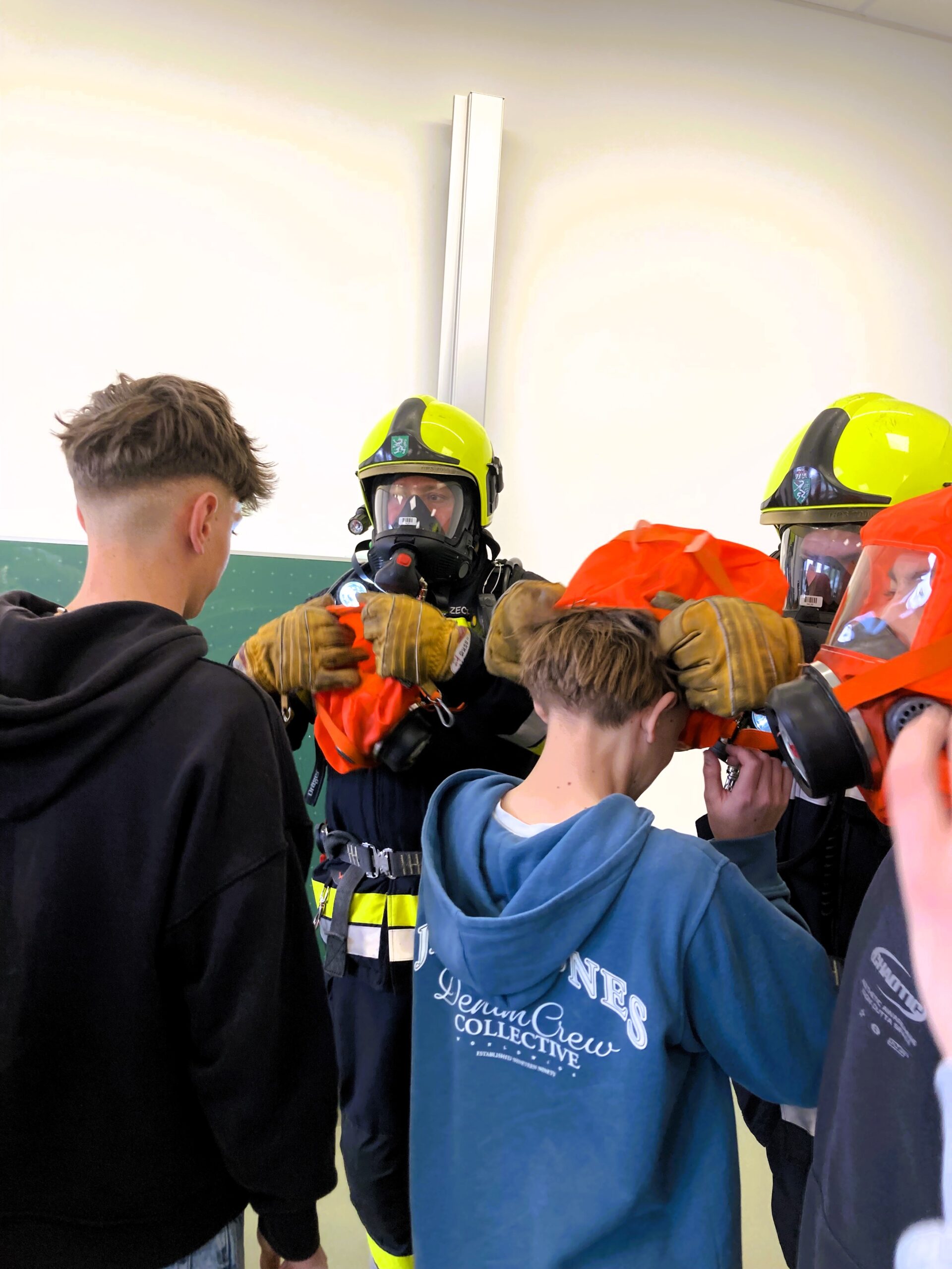 Einige Schüler wurden mit Fluchthauben ausgestattet und sicher über das Stiegenhaus ins Freie gerettet.