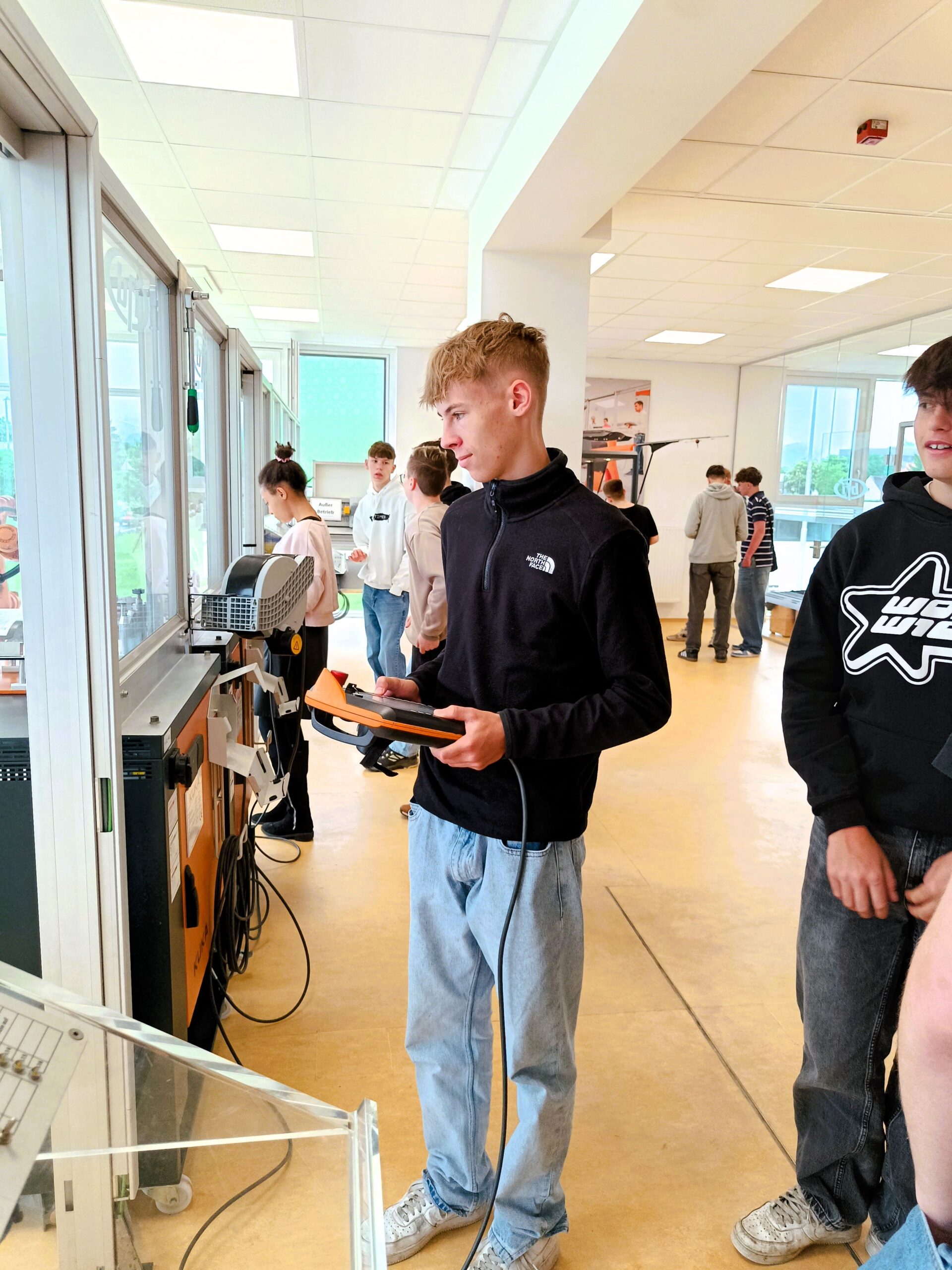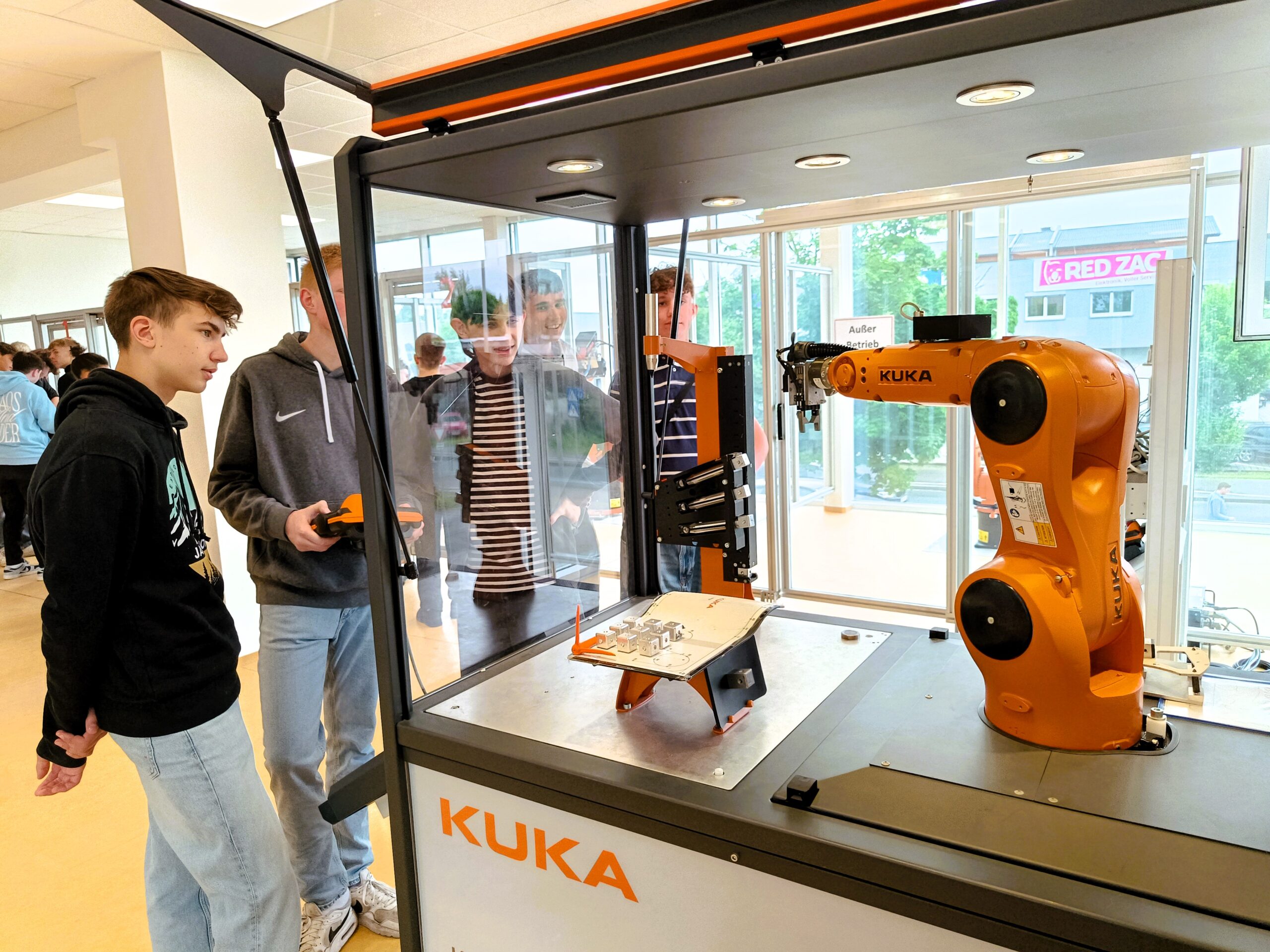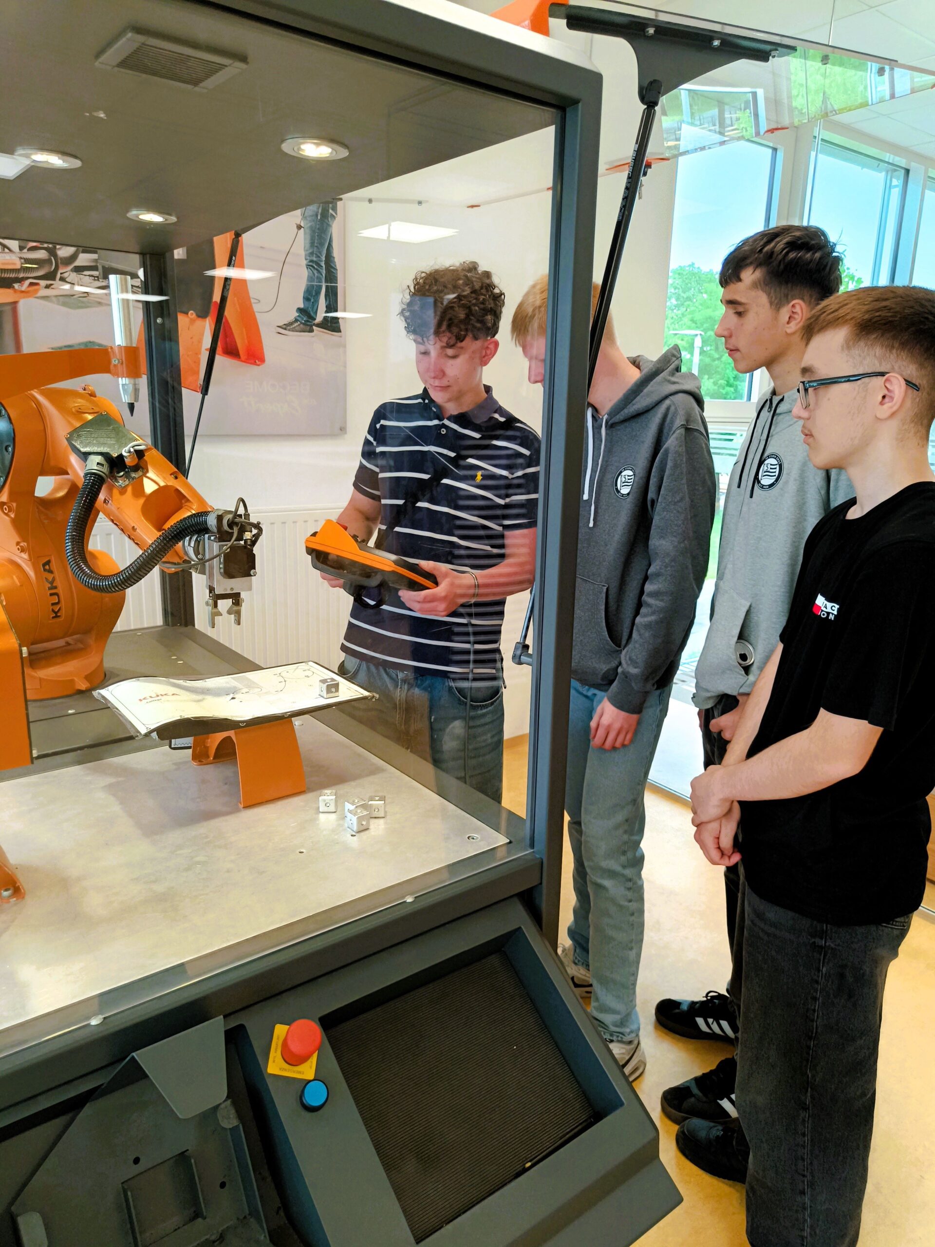 In vier Stunden erhielten die Jugendlichen einen ersten Einblick in die Welt der Roboter-Programmierung. Sie erlebten den sicheren Umgang mit Industrierobotern und erlernten grundlegende Kenntnisse über den Aufbau eines Robotersystems. Die einzelnen Gruppen stellten sich der Challenge mit einem Roboterarm Metallwürfel zu einem Turm übereinander zu stapeln. Die Schüler leisteten hervorragende Arbeit und zum Schluss wurden sie zur Belohnung mit einer Jause und Getränken versorgt.