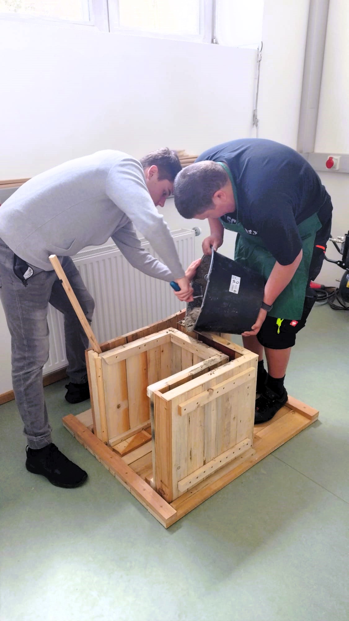 Alle teilnehmenden Schulen erhielten das gleiche Baumaterial (Schalungsbretter, Trockenbeton, Armierungseisen, ..) mit der Aufgabenstellung ein „Werkstück aus Beton, das einen sinnvollen Zweck erfüllt und für die Schule dekorativ ist“, zu entwickeln und zu bauen.