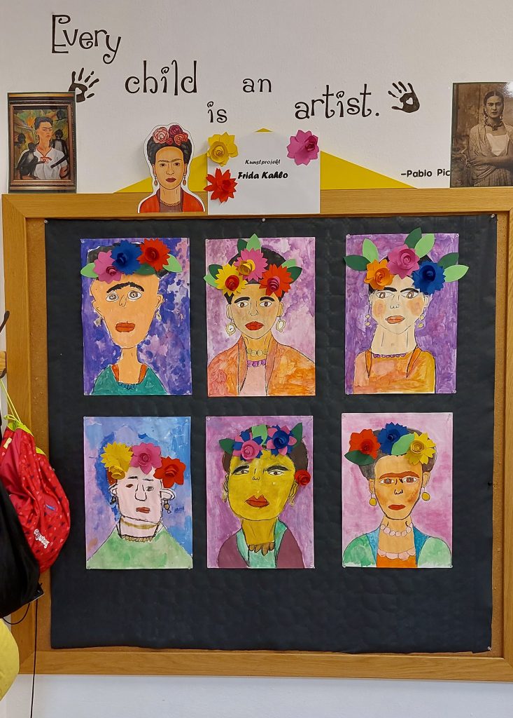 Die Kinder der Grundstufe 2 haben sich währenddessen mit Frida Kahlo beschäftigt und danach ebenfalls eine „Frida“ gemalt.
